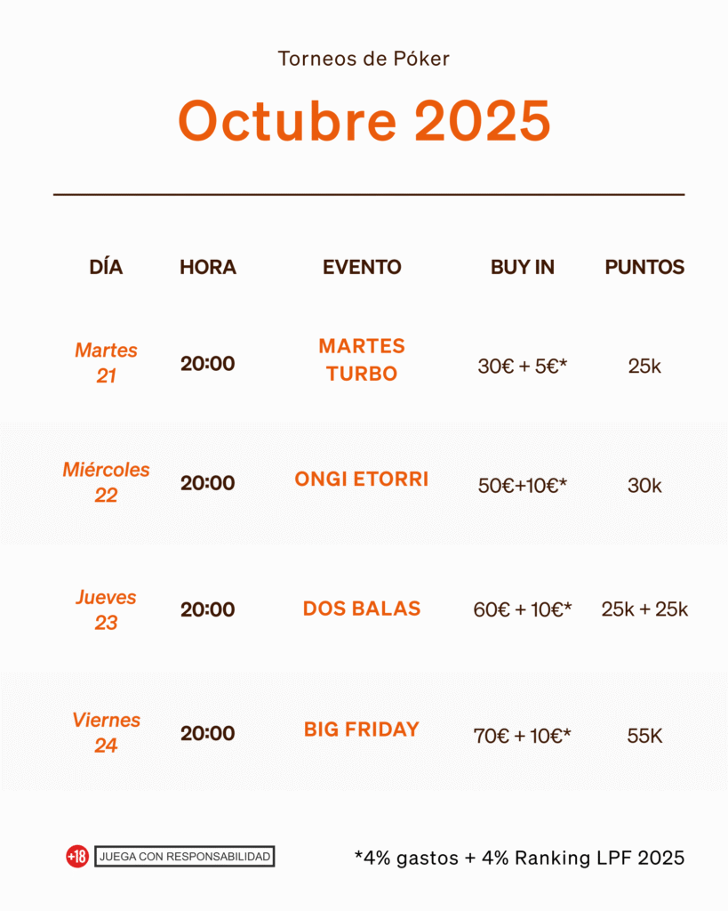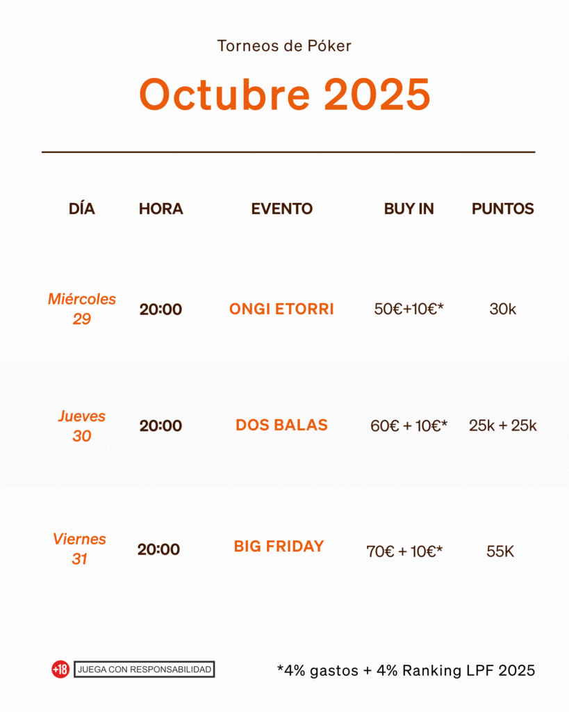 - Miércoles 22 – Ongi Etorri → Buy-in: 50€ + 10€ | Stack: 30k